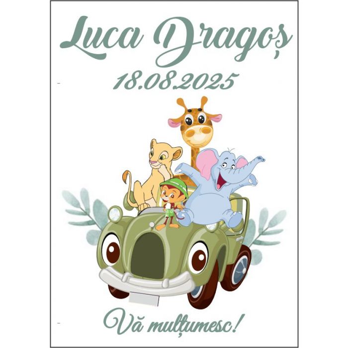 Eticheta este decorata cu masina hazlie cu animale si eucalipt si poate fi personalizata cu textul dorit de dvs. Pe eticheta se poate scrie numele bebelusului, data evenimentului si/sau un mesaj de multumire.