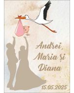 Meniu personalizat pentru nunta si botez, pliabil, design mire, mireasa si bebelus adus de barza. Contine sectiunile: meniu mancare, bautura, cockail bar si/sau candy bar.