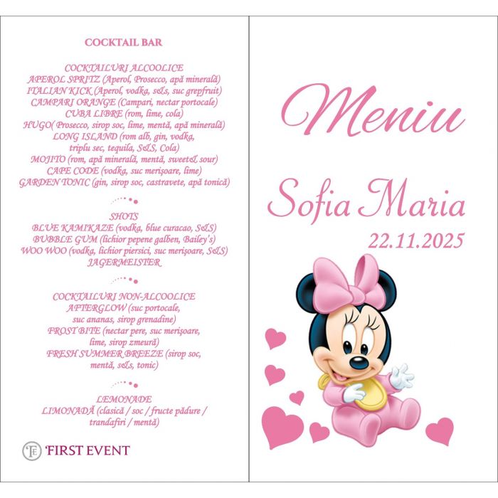 Meniu personalizat pentru botez, pliabil, design Baby Minnie Mouse. Contine sectiunile: meniu mancare, bautura, cocktail bar si/sau candy bar.