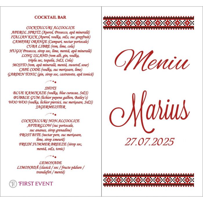 Meniu personalizat pentru botez, pliabil, design traditional. Contine sectiunile: meniu mancare, bautura, cocktail bar si/sau candy bar.